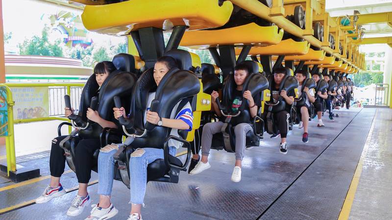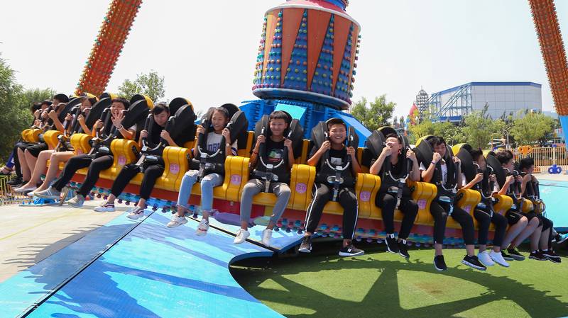 坐在两人一组的米黄色腾空飞椅上,一名年轻的姑娘轻咬贝齿,一脸的紧张和激动,在她旁边坐着的另一名女生则张开双臂,兴奋地看着下方,放声高呼。此刻她们一同坐在大同方特主题公园中的“高空飞翔”飞椅上,身处数十米的高空,与其他飞椅上的学生们如陀螺般绕着巨大的转轴飞旋,此起彼落的欢呼声在空中翻腾。