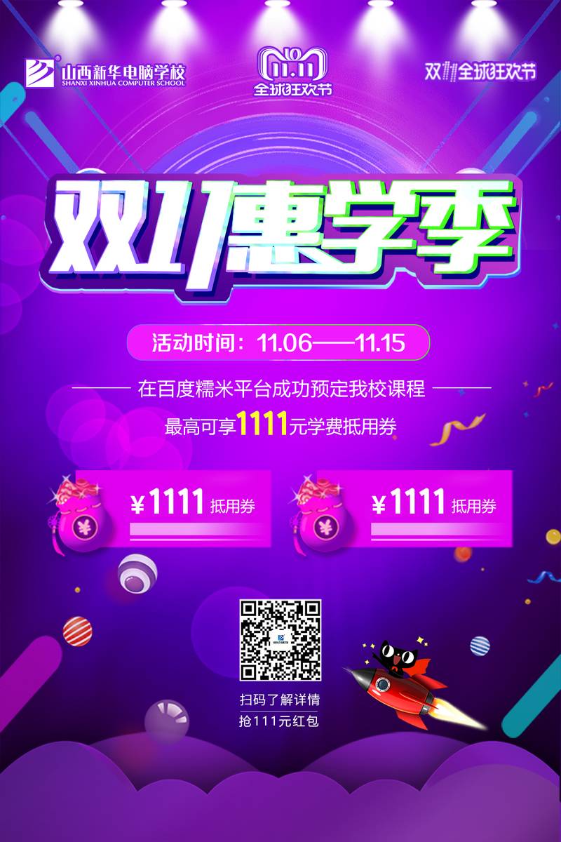 11月15日前,在百度糯米平台成功预定我校单科或私人订制团购课程、精品短期团购课程、长期团购课程的同学,分别可以享受学费总价11%减免的优惠,每月333元的住宿补贴和1111元的学费抵用券。分享我们的官方微信双11活动推文(https://mp.weixin.qq.com/s?__biz=MjM5OTAwOTM0MA==&mid=2650663263&idx=2&sn=9546cefb3af3283dc88728f1d48553d5&chksm=becb440c89bccd1ac21a91d795486bf951ab5f11330362b83222226e1f9781fdb67e2f0a59ac&token=1225525709&lang=zh_CN#rd)到朋友圈并发动好友点赞,点赞量达到111个,还可获得111元红包一个。预定长期团购课程的同学还有机会参与双十一现金红包抽奖活动,人人有奖。