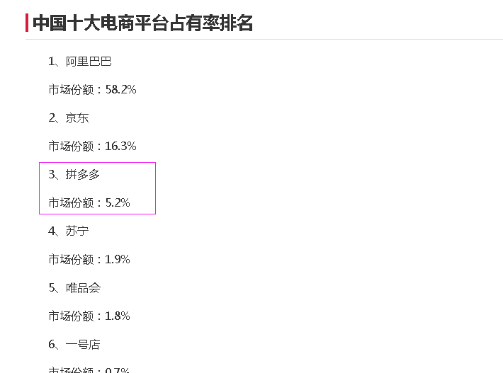 说到拼多多,相信很多小伙们都应该知道、即使没有用过、但你们的亲朋好友群里面总会有那么几个好友砍链接、自2016年拼多多发展创新式社交电商模式,迅速进入到人们的生活中。创始人洞察市场需求、利用低价优惠让用户在朋友群和微信里传播者拼团和砍价链接信息、从而建立起庞大用户群体,仅仅3年时间里用户群体达到3亿人,交易额达到千亿。同时、年初超越国内多家电商平台、前进国内电商排名三。