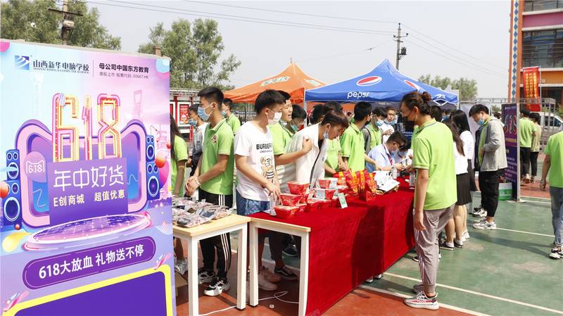 同时6月18日上午10点半,山西新华电脑学校校内618购物节正式开始。山西新华E创电商工作室组织学校电商学子,在教学楼前操场上摆摊设点,展卖开始,顾客络绎不绝,昔日安静的操场变成了热闹的“买卖街”。