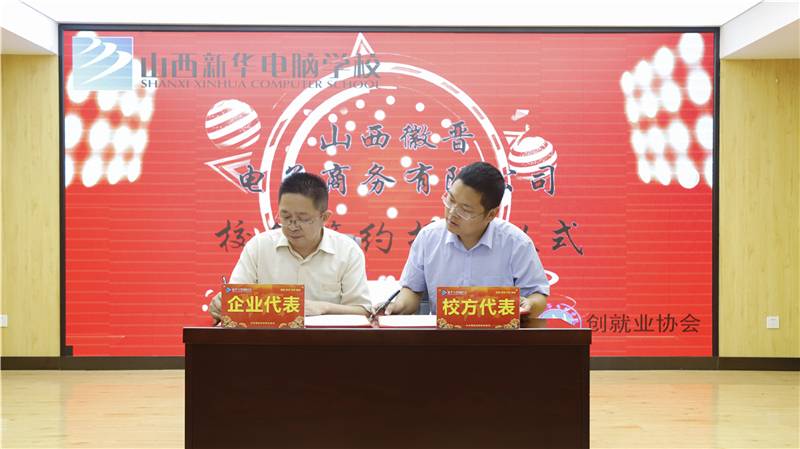 随着仪式的进行,山西新华电脑学校创就业指导中心张主管到签约席与山西徽晋电子商务有限公司董事长赵董共同签订校企合作协议,代表着徽晋电子商务有限公司正式成为了山西新华电脑学校的校企合作单位,山西新华将继续开展订单式的人才培养模式,为合作企业培养专业人才。