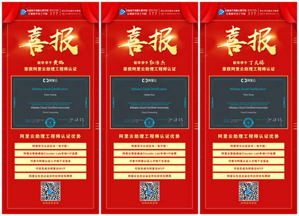 接着,领导老师们为特训营学子颁发结业证书及荣誉证书。其中,黄端、郭浩杰、丁天赐三位学子已顺利拿到阿里云认证证书,可享受阿里云优先聘用。
