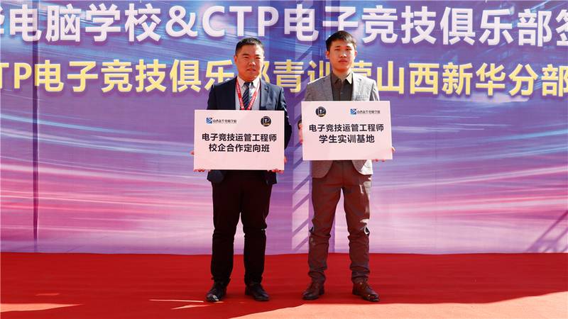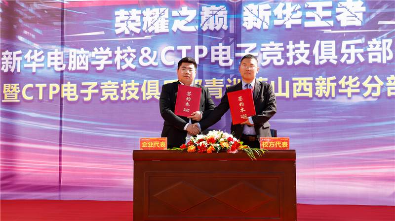 随着仪式的进行,在全体参会人员的见证下,山西新华电脑学校创就业指导中心张主管到签约席与CTP俱乐部马经理共同签订校企合作协议。校企合作协议的签订,标志着CTP电子竞技俱乐部正式成为我校校企合作单位。山西新华将持续开展校企合作和订单式人才培养模式,为企业培养更多的优秀人才。