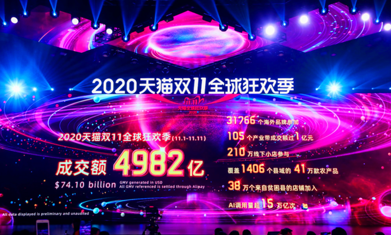 4982亿元!11月12日零时,阿里巴巴发布的数据显示,2020年天猫双11全球狂欢季(11月1日至11日)总成交额(GMV)达到4982亿元人民币(约合741亿美元)。