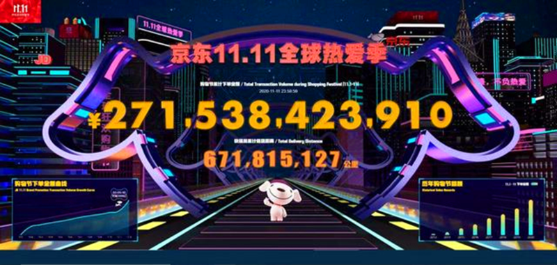 此外,2020年11月1日0时至11月11日23:59,京东11.11全球热爱季累计下单金额超2715亿元,超过去年同期的2044亿元,再度刷新纪录。苏宁易购也发了战报。11月1日至11日23点59分,苏宁易购双十一线上订单量增长75%。