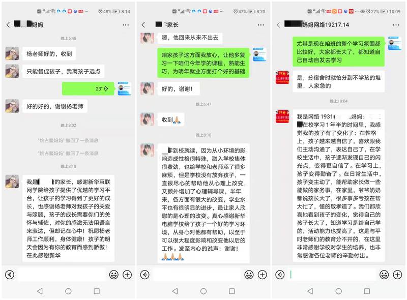 在家访后,很多家长还私信了班主任。“对你的感激无法用语言来表达,但却记在心中!”“孩子的明天会因为有你的教育而感到骄傲!在此感谢新华”“真心感谢新华电脑学校给了孩子一个好的学习环境,从身心对他都有帮助,以至于可以很大程度影响和改变他以后的工作。发至内心的说声:谢谢!”……一句句质朴的感谢,令每一个新华教职工感动不已,这是对山西新华育人工作的最大肯定和鼓励,也更是责任和鞭策,全体山西新华人将以此为动力,给家长、给学校、给社会交出更加满意的育人答卷。