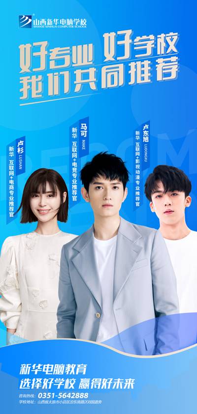 他是马可,是《家有儿女》里的“狂野男孩”,小小年纪便家喻户晓,后来《花千骨》里的“杀姐姐”让他再次备受关注;她是卢杉,因出演《楚留香新传》而崭露头角,更是大爆剧《琅琊榜》里的“靖王妃”,聪明伶俐、端庄大气;他是卢东旭,是《我的盖世英雄》里的阳光大男孩,也是《百里挑一》中的无畏少年。他们虽同为演员,却本无交集,现在他们拥有了一个共同的身份——新华电脑教育专业推荐官!