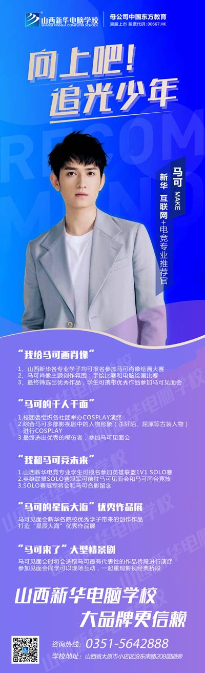 新华互联网科技在注重学生的学习的同时,还丰富学子的文化生活,给学子提供各种展示平台,学子可以在社团满足多种兴趣需求,还可以参加国际大赛展示实力。本次马可推荐官在全国新华院校发出邀请,希望有想法,有创意的学子参与“向上吧,追光少年”活动,将有机会4月28日与马可一同参观校园、体验校园黑科技、电竞友谊赛等活动,马可也将在直播间与大家见面。