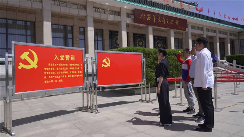 全体党员在纪念馆前重温了入党誓词,“我志愿加入中国共产党。”一句句铿锵有力的誓词在山林古松之间阵阵传响,与太行山间的风声相伴共鸣,字正腔圆而又整齐划一的声音也呈现着这一批教师党员特有的职业精神风貌和饱满教育热情。