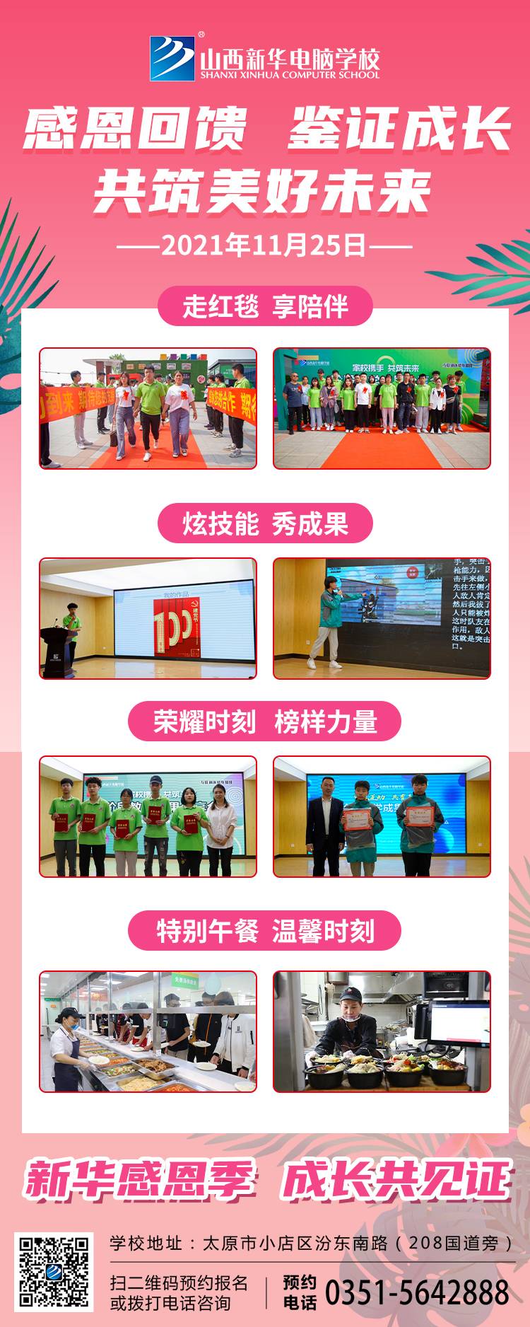 山西新华一路前行,一路成长,一路收获,一路壮大。而这一切,最应该感谢的是一直相知相伴的每一位家长与学子。感谢有你们,在山西新华电脑学校发展的道路上,留下了信任和支持,留下了鼓励和掌声。值此感恩节来临之际,山西新华电脑学校特于11月25日举行“新华感恩季,成长共见证”家校鉴证会,邀请你们一起来见证孩子成长蜕变时刻。