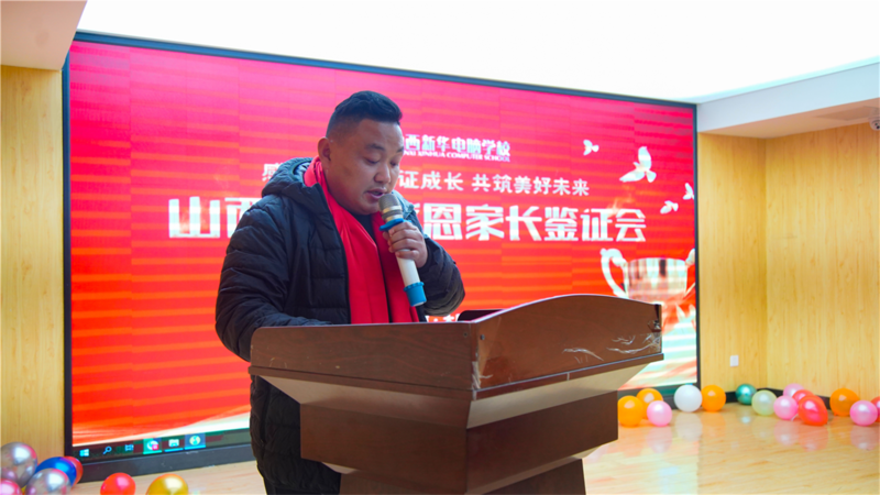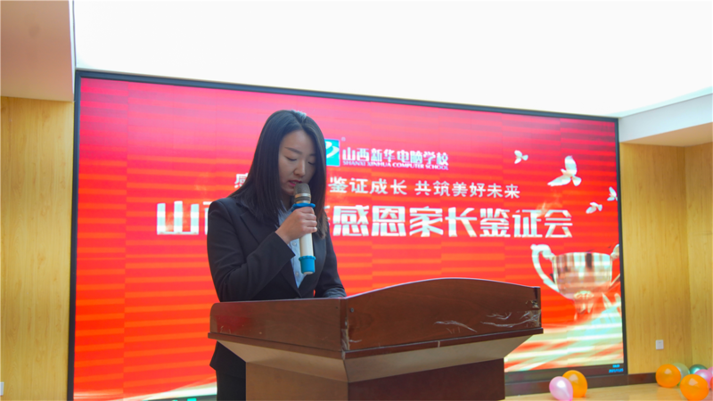 活动最后,山西新华电脑学校校长助理王助理为本次感恩家长鉴证会做感恩献礼。表达了对学生的关心与爱,同时承诺学校全体教职员工时刻秉承“团结、务实、开拓、奉献”的新华企业精神,牢记“爱与责任”的教育根本,励精图治,以学生为本,关爱学生成长,严把教学质量关,注重教学过程管控、学风建设和人才培养,为社会培养德才兼备的互联网优秀人才。选择一所好学校,成就一个好未来!请家长放心把孩子交给我们,我们定不负众望!