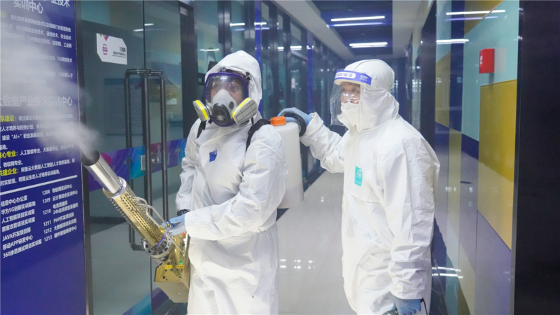 消毒人员身穿防护服,手持喷雾器,严格按照规定程序,采用“地毯式”的消杀方式,对教室、实训中心、楼梯、楼道、厕所、垃圾桶以及公共区域进行了全面细致的消杀。消毒过程中,消毒人员严格按照消毒剂使用说明配比、防疫物资佩戴齐全,闭窗消杀待半小时后通风擦拭,本着专业负责的态度不放过任何一个死角,确保消毒彻底,不遗漏任何一个角落,让病毒细菌无处藏身。