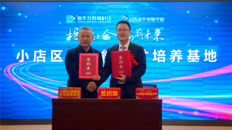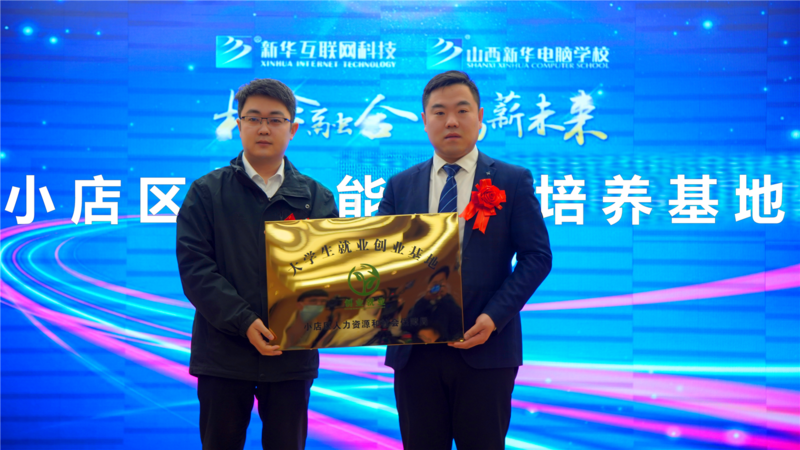 在众人的瞩目和掌声中,太原市小店区人社局局尚红宝局长与山西新华电脑学校王家贤校长共同签署了培养协议,并为基地授牌。双方将以高技能人才培养与大学生就业创业基地成立为契机,实现人才培育与区域经济前沿发展需求有效接轨,充分发挥省校合作优势,为学生提供更好的创就业保障,也有助于地方区域集聚新人才,激发新动能,实现新发展,真正做到互惠共赢!