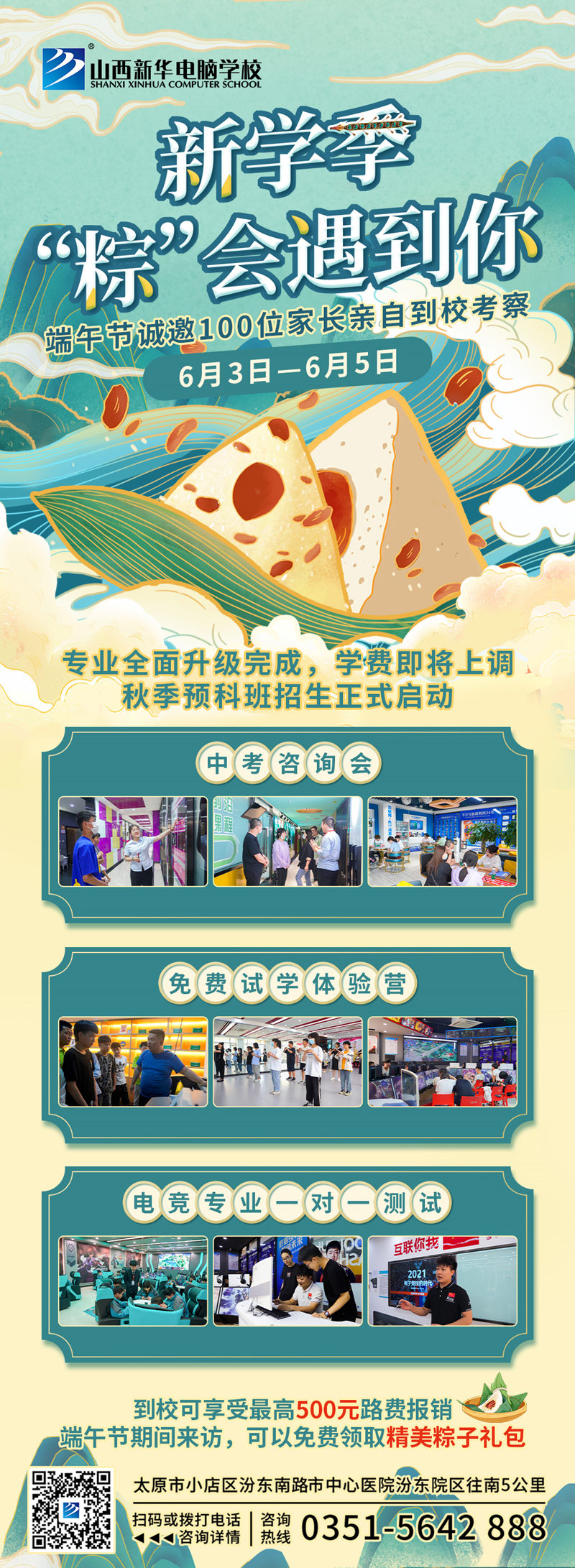 一年一端午,一岁一安康。端午小长假即将来临,作为初高中毕业生的你,选择好学校了吗?毕竟提前择校,做好两手准备很重要。如果你还没有选择到好的职业学校,不要慌,山西新华“新学季,‘粽’会遇到你”端午试学体验营来帮你。同时,我们诚邀100位学生家长朋友参与“百人考察团”免费到校考察,众多精彩试学课和教育专家一对一咨询,为每一个来咨询的学生和家长提供一个零距离向专家咨询的机会,答疑解惑、解决难题,让学生在择校路上少走弯路。