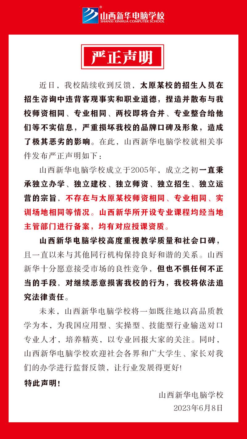 近日,我校陆续收到反馈,太原某校的招生人员在招生咨询中违背客观事实和职业道德,捏造并散布与我校师资相同、专业相同、两校即将合并、专业整合给他们等不实信息,严重损坏我校的品牌口碑及形象,造成了极其恶劣的影响。在此,山西新华电脑学校就相关事件发布严正声明如下: