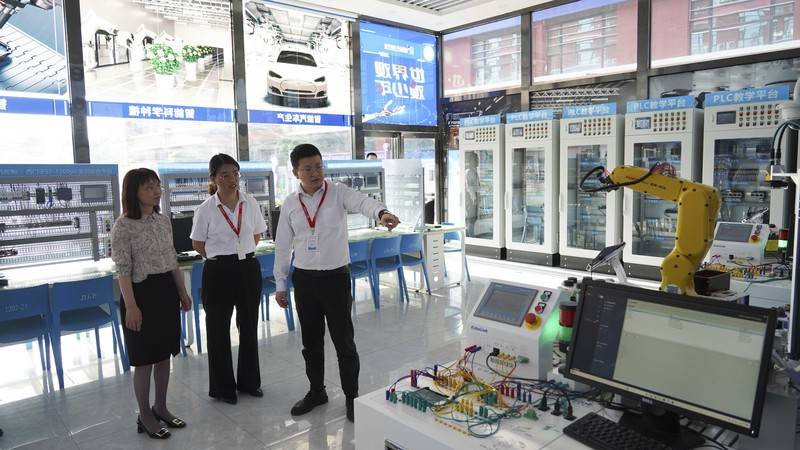 随后,领导们参观了学校的网络安全、大数据、直播电商、环艺设计及智能工业机器人等校企实训中心。他们深入了解了学校的教学硬件与软件建设情况,对配备的先进教学设备和专业教学团队表示赞赏。这些实训中心为学生提供了高质量的教学体验,使他们能够在实践中深入学习和掌握专业知识与技能。领导们特别强调了校企实训在培养综合型人才中的关键作用。